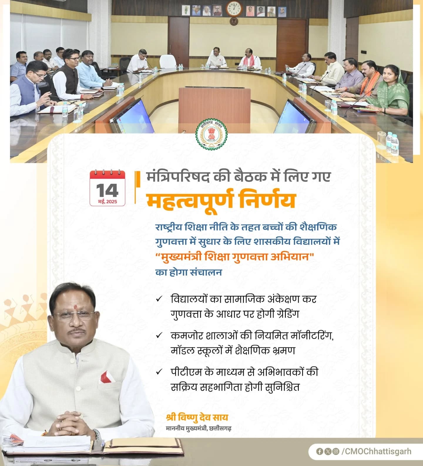 1 मंत्रिपरिषद ने राष्ट्रीय शिक्षा नीति के तहत बच्चों की शैक्षणिक गुणवत्ता में सुधार के लिए राज्य के शासकीय विद्यालयों में ‘‘मुख्यमंत्री शिक्षा गुणवत्ता अभियान का संचालन करने का अहम निर्णय लिया गया।
