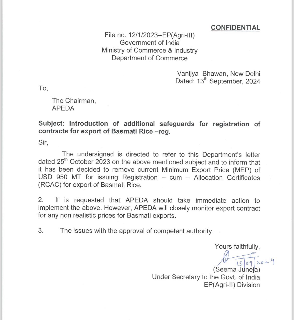 केन्द्र सरकार ने बासमती चावल के निर्यात पर न्यूनतम मूल्य हटाया