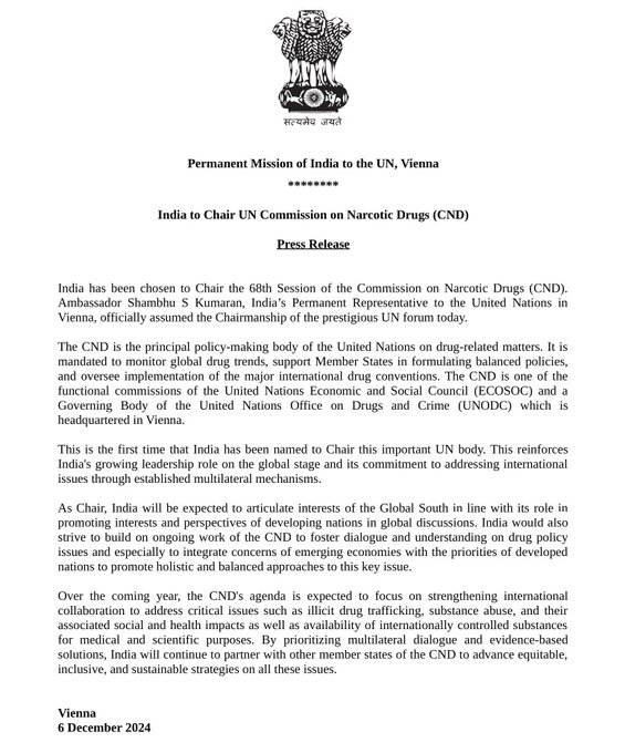 भारत, संयुक्त राष्ट्र मादक पदार्थ नियंत्रण आयोग के 68वें सत्र की अध्यक्षता करेगा। आस्ट्रिया की राजधानी वियना में, संयुक्त राष्ट्र में भारत के स्थायी प्रतिनिधि शंभु कुमारन ने कल आयोग के अध्यक्ष का पदभार संभाला। यह पहली बार है जब भारत को संयुक्त राष्ट्र की इस महत्वपूर्ण संस्था की अध्यक्षता के लिए नामित किया गया है।