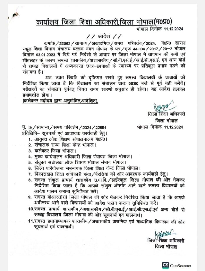 भोपाल जिले में तापमान में कमी एवं शीतलहर के कारण समस्त शासकीय, अशासकीय, सीबीएसई एवं अन्य बोर्ड से संबद्ध विद्यालयों में अध्यनरत छात्र-छात्राओं के स्वास्थ्य पर प्रतिकूल प्रभाव पड़ने की संभावना के दृष्टिगत समस्त विद्यालयों के प्राचार्यों को जिला शिक्षा अधिकारी भोपाल द्वारा निर्देशित किया गया है कि विद्यालय का संचालन प्रातः 9:00 से पूर्व नहीं करें। परीक्षाओं का संचालन पूर्ववत नियत समय सारणी अनुसार ही रहेगा। जिला शिक्षा अधिकारी द्वारा यह आदेश तत्काल प्रभावशील किया गया है।